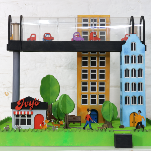 Fellow maker Mark and I collaborated on creating this model and we started by planning out the dimensions and the kind of materials we should use to bring Ivy’s invention idea to life. We thought we could use acrylic for the tunnel to make it look like glass and use plywood for the other things like the buildings and animals. We knew Ivy was going to come to the workshop to visit us so we got started on a few things to show what the model could look like, and got started on the motor mechanism which would make it look like the model cars were going through the tunnel. We needed to connect up a button for this so visitors to the invention could switch it on and off.