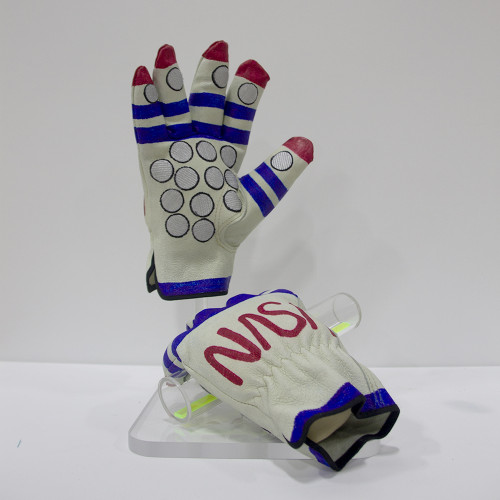 Une fois les gants placés sur leur socle en acrylique, on peut apercevoir le détail des «grippes» qui permettront aux astronautes de manier différents outils dans l'apesanteur de l'espace sans risquer de les échapper!