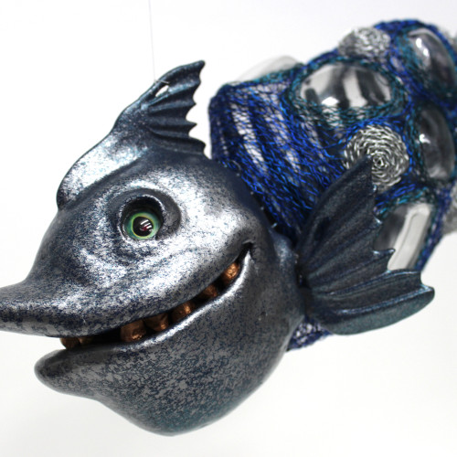 I wove the net of the Garbage Sea Sweeper using metal wire as well as nubs from the bottom of a plastic pop bottle. I liked the idea of incorporating plastic waste into the design itself and the plastic also allows us to see the skeleton of the sharky-fish. I imagine that the skeleton is mechanical and helps the creature to swim. I'm very excited to have completed this sculpture. Thanks to Luiza and Little Inventors for this opportunity. I had so much fun making the Garbage Sea Sweeper!